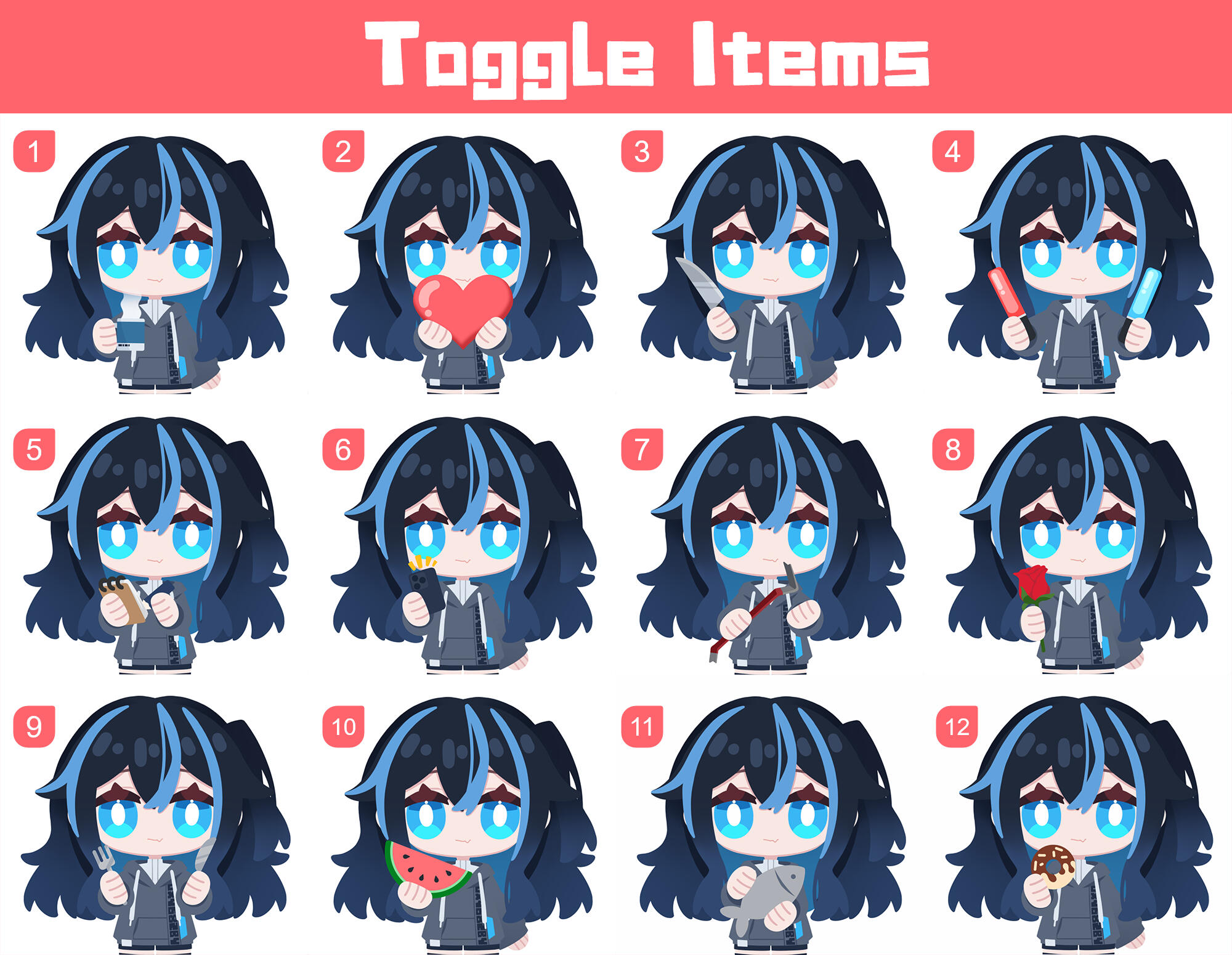A: Since adding new parts increases the size and resource occupancy of the model, if the model contains too many parts, the model will eventually become laggy and even unusable on some devices. My customizable models are primarily designed for streaming purposes, hence, the performance of the model must be taken into consideration when updating the model. With that being said, I will only consider adding parts that are requested by many users.