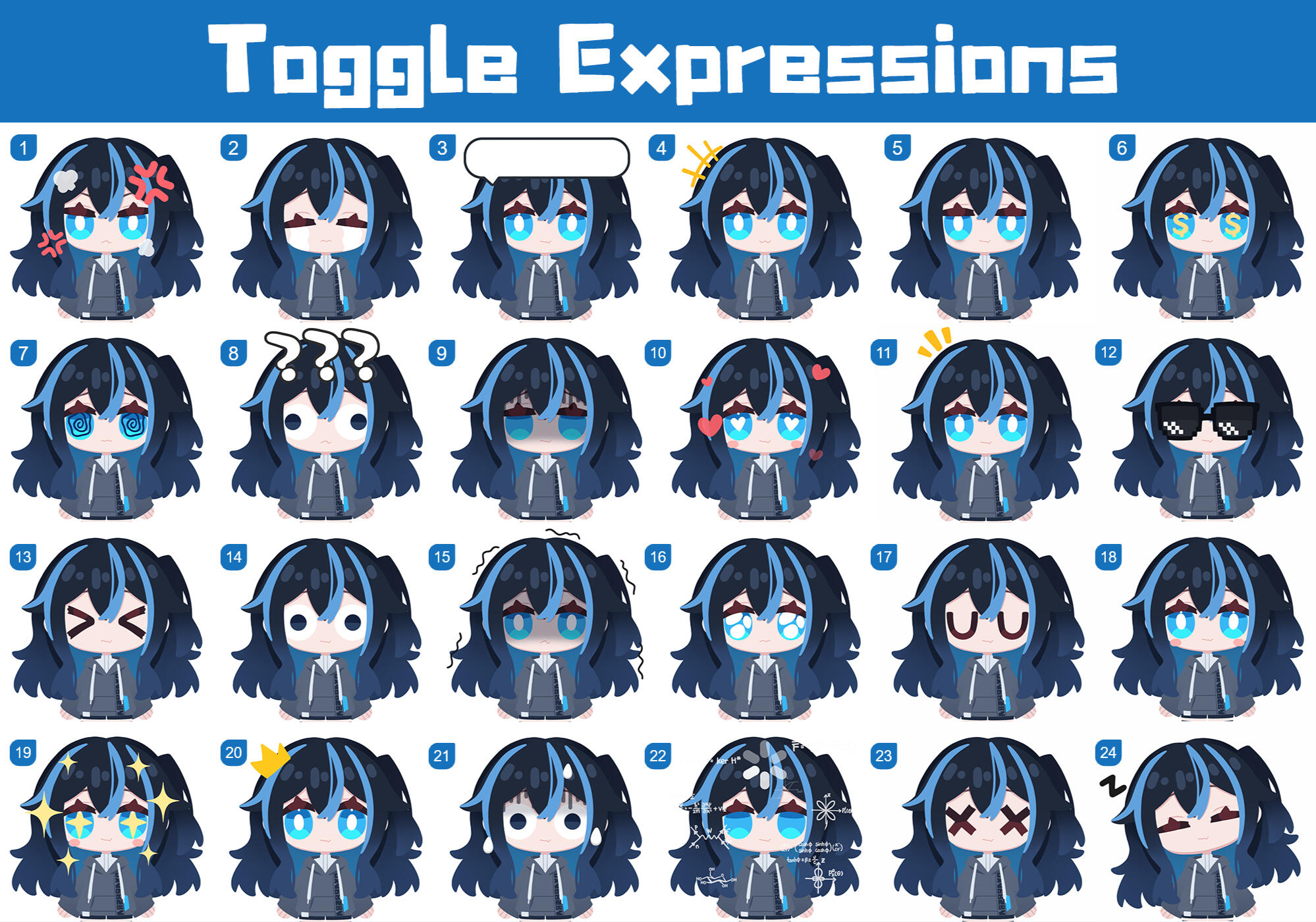Includes: Head angle XYZ, body angle Z, bouncy physics, 24 toggle expressions, 1 idle animation, 1 lost tracking animation (sleep).